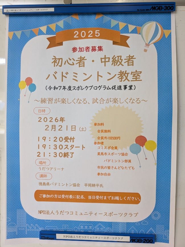 初級・中級者バドミントン教室を2月21日(土)午後7時30分〜午後9時30分にうだつアリーナで開催します。参加希望者は、当日受付ますので、ご参加ください。参加料は、会員は無料、会員外は500円です。